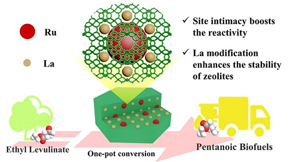 近日,中國科學院大連化學物理研究所催化與新材料研究室張濤院士、羅文豪副研究員團隊和荷蘭烏特勒支大學Bert M.Weckhuysen教授合作,設計并構筑具有金屬-酸“限域毗鄰”結構的分子篩雙功能催化劑,實現了無溶劑體系下由纖維素醇解平臺分子乙酰丙酸乙酯“一鍋法”高效制備戊酸酯類生物燃油的新路線。