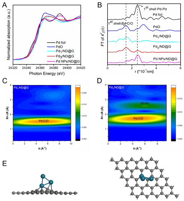 圖1. (A) X射線吸收近邊結構譜圖;(B) 傅里葉變換后R空間徑向結構函數;(C, D) Pd1/ND@G和Pd3/ND@G的EXAFS振蕩小波變換;(E) Pd3 金屬團簇的最優結構模型圖(左:側視圖,右:俯視圖)。