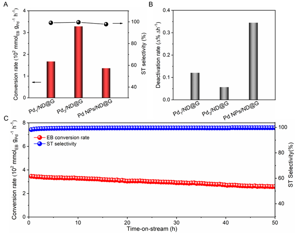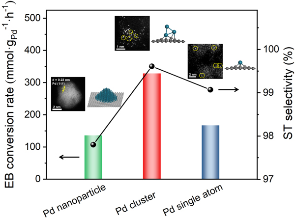 劉洪陽研究團隊近年來一直致力于亞納米尺度金屬催化材料的精準設計與烷烴高效利用研究,發表論文2篇。在前期研究工作基礎之上,研究團隊在納米金剛石-石墨烯雜化載體上構造了亞納米尺度完全暴露Pd金屬團簇,經球差電鏡和X射線吸收精細結構(圖1)分析表明,Pd金屬團簇由平均三個Pd原子組成(Pd3/ND@G)并通過Pd-C鍵錨定在富缺陷石墨烯表面。與Pd單原子和Pd納米顆粒催化劑相比,完全暴露且原子級分散的Pd3金屬團簇催化劑在乙苯低溫脫氫制苯乙烯反應中具有最高的乙苯轉化率(328 mmol gPd-1h-1)和苯乙烯選擇性(>99%),并且在350 C無氧反應條件下表現出優異的穩定性(圖2)。密度泛函理論(DFT)計算結果表明(圖3),Pd3金屬團簇中相鄰金屬Pd原子之間的協同作用確保了乙苯分子中乙基上C-H 鍵的高效活化和苯乙烯的快速脫附,是Pd3/ND@G催化劑催化性能優于Pd單原子和Pd納米顆粒催化劑的關鍵。本項工作實現了對亞納米尺度Pd金屬團簇結構的精準控制,并為新型烷烴脫氫工業催化劑的設計提供了一條新的途徑。