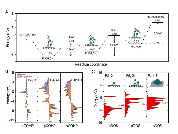 圖3. Pd催化劑上乙苯直接脫氫反應能量變化曲線及投影晶體軌道哈密頓布居(pCOHP)和投影態密度(pDOS)結果分析。