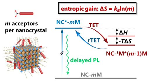 延遲發光現象對CsPbBr3量子點的光化學應用具有重要意義。得益于CsPbBr3量子點巨大的吸光系數和快速的發光速率,其在發光器件和量子光學等領域具有顯著優勢。然而,快速的發光速率(納秒級別壽命)嚴重制約了該類材料在光化學/光催化領域的應用。團隊基于CsPbBr3量子點-菲甲酸體系中的百微秒量級延遲發光壽命,在溶液中通過擴散控制的電子轉移過程實現了對蒽醌底物分子的高效光還原轉化。同時,團隊還發現該延遲發光機制中熵效應可能發揮的重要角色,在量子點-有機分子雜化體系中,一個量子點的表面通常吸附著幾十到幾百個受體分子。因此,從量子點到分子傳能的過程中伴隨著巨大的紊亂度增加(即熵增)。在室溫下,該熵增對應的吉布斯自由能變化約為0.1電子伏特量級。對從分子到量子點的熱活化反向傳能過程而言,這是一個額外的勢壘,對延遲發光壽命具有重要調制作用。在該思路的指導下,團隊推導了熵效應調控延遲發光動力學的通用物理模型;并使用CsPbBr3量子點-菲甲酸體系進行了實驗上的驗證。該研究通過簡單改變給受體之間的數目比例,即可定量調控延遲發光壽命,開辟了一種“預設計”發光材料激發態壽命的新途徑。