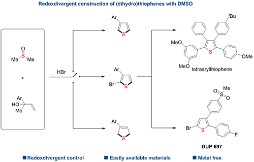 陳慶安團隊一直致力于發展不同催化體系,以實現烯烴選擇性催化轉化與合成。在前期相關研究(Angew. Chem. Int. Ed.,2019;Angew. Chem. Int. Ed.,2020;Angew. Chem. Int. Ed. 2021;Angew. Chem. Int. Ed.,2021)的基礎上,最近,該團隊利用二烯前體烯丙醇和DMSO、HBr為原料,采用氧化還原發散性的策略構建噻吩和二氫噻吩。團隊通過簡單地改變DMSO和HBr的用量來調控氧化還原程度,從而得到不同氧化還原態的產物。此外,團隊還進行一系列控制實驗和動力學研究,解釋了反應的機理和氧化還原態控制的原因。為了進一步驗證該反應的實用性,團隊還進行了一系列的轉化實驗,利用(二氫)噻吩產物,能夠得到一系列五元含硫雜環化合物,尤其是能快速地程序化合成不同四芳基取代的噻吩、環氧合酶-2(COX-2)抑制劑DUP 697及其區域異構體。