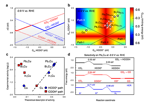 CO2電還原制備甲酸鹽的雙頂點一維(a)、二維(b)“反應(yīng)相圖”。基于雙通道的理論和實驗活性趨勢對比(c)。CO2電還原自由能變化圖用于研究Pb1Cu單原子合金選擇性(d)。
