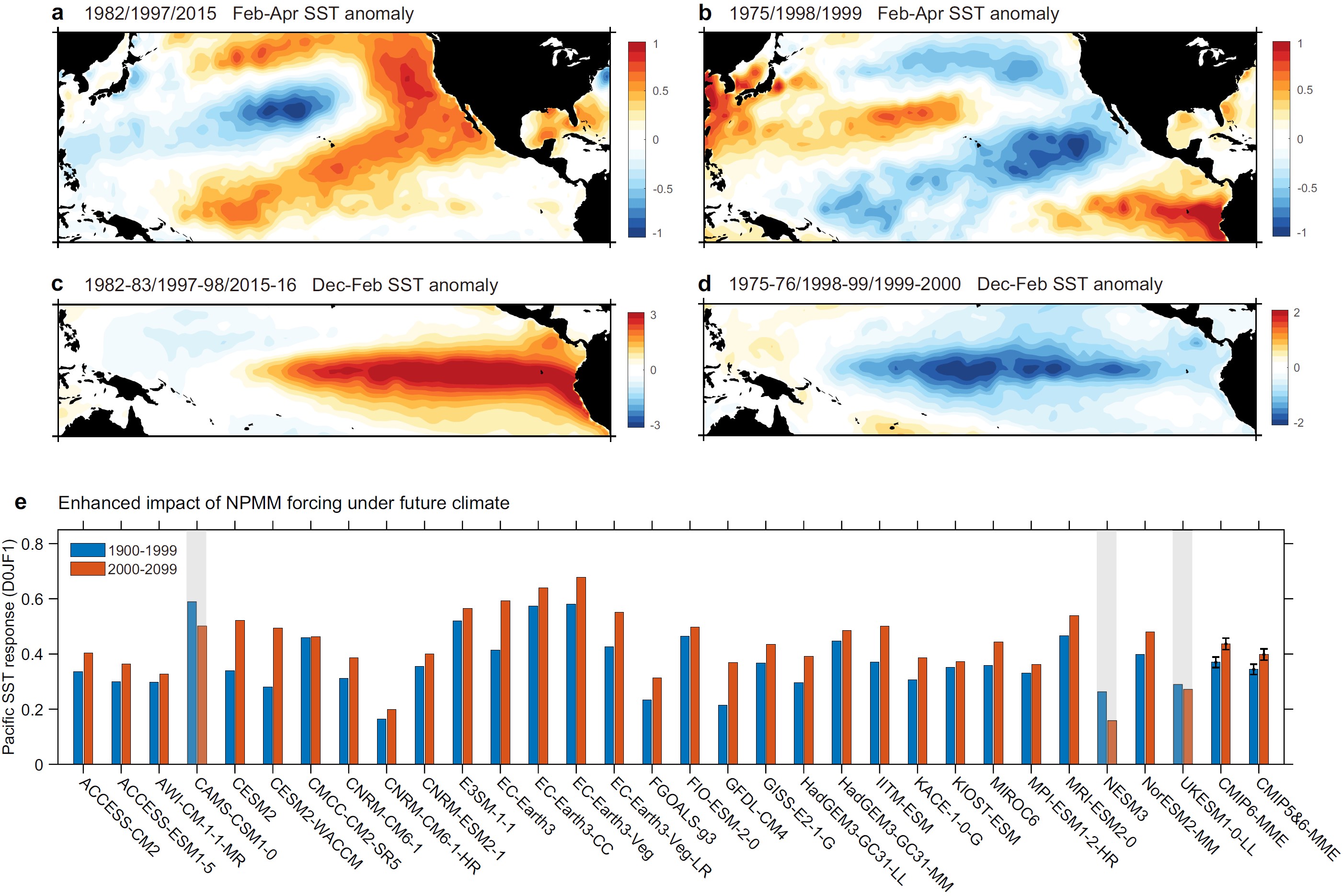 北太平洋經向模態(NPMM)是東北太平洋海-氣耦合的主模態,也是連接中高緯大氣變率與熱帶海洋的重要通道之一,其峰值出現在北半球春季。NPMM可通過風-蒸發-SST(WES)反饋、夏季深對流響應和信風充放電等過程對當年厄爾尼諾-南方濤動(ENSO)的發生、發展和多樣性等產生影響,是ENSO的有效預測因子,也可部分解釋ENSO在2000年前后的特征變化。1950年以來超過50%的厄爾尼諾(拉尼娜)事件都伴隨有當年春季的正(負)NPMM事件,其中包括了三次極端厄爾尼諾事件(1982-1983、1997-1998、2015-2016厄爾尼諾)和一次極端拉尼娜事件(1998-1999拉尼娜)(圖a-d)。隨著全球變暖,NPMM對ENSO的影響如何變化尚不清楚。