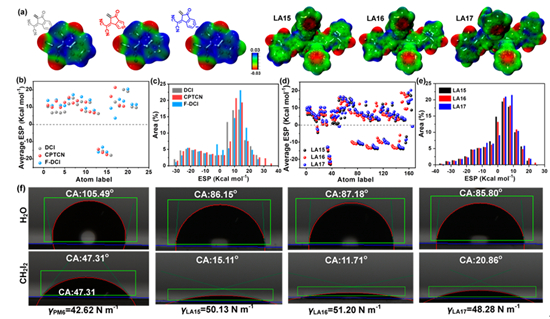 圖2. (a) 端基與SMAs的ESP圖。(b和c) 端基中原子的平均ESP和ESP區(qū)域分布。(d和e) SMAs中原子的平均ESP和ESP區(qū)域分布。(f) SMAs薄膜接觸角圖。