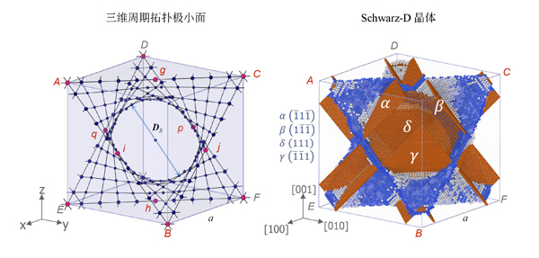 不同于常規(guī)晶體結(jié)構(gòu)及合金相圖中亞穩(wěn)相(包括Laves幾何拓撲相及準(zhǔn)晶)的原子點陣概念,Schwarz晶體結(jié)構(gòu)單元,概括地講,是通過一類或一類以上晶界,例如在空間中能隨意彎曲的普通晶界和傾向于平直的特殊晶界(如共格孿晶界),按照特定空間對稱性,對晶體沿三維極小面進行周期性切分的產(chǎn)物(圖1)。這種廣義的晶體結(jié)構(gòu)單元,通過熱激活或外力作用,由多晶金屬內(nèi)部原子自發(fā)形成,揭示了金屬中一類具有特殊結(jié)構(gòu)和新奇性能的固態(tài)亞穩(wěn)結(jié)構(gòu)。