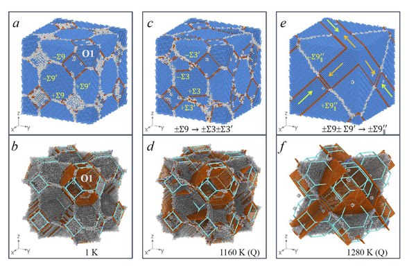 依據(jù)Kelvin猜想,研究人員首先構(gòu)造出了包含16個晶粒大小相等、形狀均為截角正八面體的多晶模型。但有別于一般多晶模型,他們通過調(diào)控晶粒取向,在Kelvin晶體里引入了完美的三維共格孿晶界網(wǎng)絡(luò)。在分子動力學(xué)模擬中,對Kelvin多晶均勻加熱,伴隨溫度升高,觀察到了一系列復(fù)雜的晶界弛豫和演化行為,包括晶界分解、遷移,彼此吞噬或兼并(圖1)。當(dāng)溫度足夠高時,在四個不同<111>方向均被共格孿晶界約束的截角八面體晶粒會發(fā)生明顯的定向生長,從而推動整個晶界網(wǎng)絡(luò)趨近并最終形成Schwarz-D極小面。從Kelvin多晶轉(zhuǎn)變成Schwarz-D晶體,整個過程如同發(fā)生了相變,其結(jié)果是有效降低了晶界面積,消除了Kelvin多晶中所有由界面交接導(dǎo)致的棱角(晶界三叉線和四級點),不僅有效降低了體系自由能,還使原始晶界網(wǎng)絡(luò)演化成受孿晶界全方位約束,空間連續(xù)貫通并呈現(xiàn)周期性規(guī)則排列的極小曲面晶體。他們還發(fā)現(xiàn),晶界網(wǎng)絡(luò)做上述選擇性調(diào)整的路徑并不唯一,進而揭示了形成Schwarz-D晶體的“多形性”動力學(xué)演化特征。