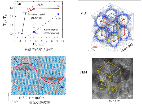 圖2 Schwarz-D受限晶體熱穩(wěn)定性尺寸效應(yīng)、晶體受限效應(yīng)、分子動力學(xué)模擬及實驗觀測對照
