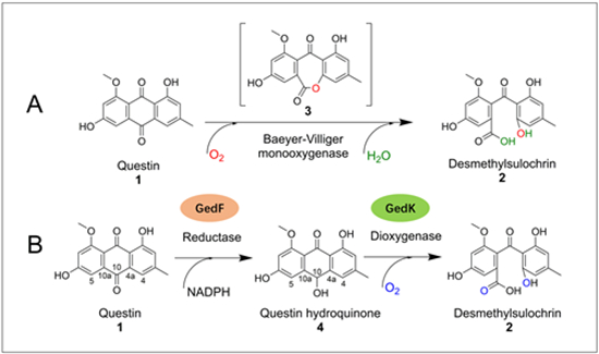 大黃素-8-甲醚是一種蒽醌類化合物,也是土曲霉地曲霉素生物合成途徑中的關鍵中間體。基于前期同位素追蹤實驗和日本學者Sankawa等的研究結果,長期以來科學界一直傾向于大黃素-8-甲醚的Baeyer-Villiger氧化開環假說。基于該假說,一個Baeyer-Villiger氧化酶催化大黃素-8-甲醚生成具有七元環結構的中間體,進而水解開環形成開環產物desmethylsulochrin。但是,本工作中研究人員通過一系列體內敲除和體外酶活表征研究發現,GedF和GedK兩個酶共同催化了大黃素-8-甲醚的開環過程,其中GedF首先催化還原大黃素-8-甲醚產生大黃素-8-甲醚氫醌,進而大黃素-8-甲醚氫醌在GedK的作用下開環產生desmethylsulochrin(圖1)。