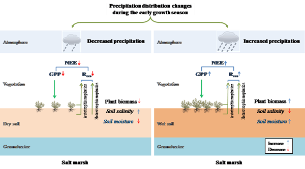 圖1 植被生長早期降雨變化對濱海濕地碳交換的影響機制