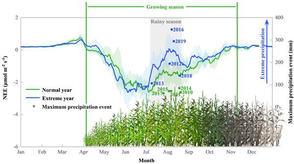 圖2 極端降雨及其淹水對濱海濕地年際NEE變化的影響
