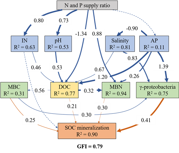 基于增溫野外控制試驗平臺(增溫2.4 ),發現6年的持續增溫不僅改變了濱海濕地微生物群落的多樣性,同時也改變了微生物之間的相互作用關系。真菌對增溫表現出較強的耐受能力,這種耐受能力同時穩定了真菌與其他兩類微生物之間的聯系。另外,跨域網絡模塊與土壤有機質的負相關關系在增溫條件下強化,這可能對土壤碳儲存功能造成威脅(Zhou et al. 2021, Global Change Biology)。另外,野外長期氮磷添加控制試驗平臺5年的監測數據表明,氮磷輸入通過提高土壤養分有效性刺激植物生長并改變土壤微生物群落結構,進一步導致土壤中活性有機碳組分(可溶性有機碳(DOC)和微生物生物量碳(MBC))增加,而芳香DOC含量減少,這些變化共同作用影響土壤有機碳礦化作用。其中,當氮磷輸入比例為15:1時,土壤有機碳礦化作用最為強烈(Li et al. 2022, Catena)。