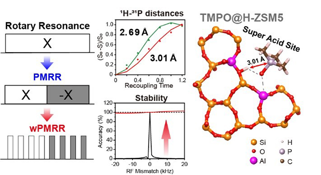 近日,中國科學院大連化學物理研究所固體核磁共振及催化化學創新特區研究組研究員侯廣進團隊開發了一種高效且適用性廣泛的固體核磁共振脈沖技術——相位調制轉動共振(Phase Modulated Rotary Resonance,PMRR),可用于核間距離的精準測量,團隊利用該技術精準測量了三甲氧膦(TMPO)在H-ZSM-5分子篩Br?nsted酸位上的吸附結構。