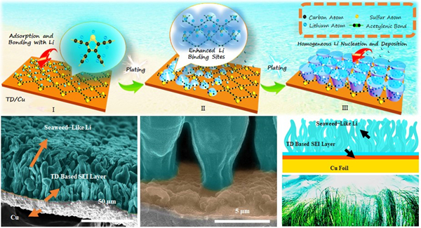 在上述研究基礎上,該研究組進一步通過分子結構設計將具有較大電負性和親鋰作用的含硫噻吩官能團與炔鍵相連,報道了一種通過誘導沉積的方法直接在集流體表面實現可控制備薄層海藻狀金屬鋰負極以提高鋰金屬電池循環穩定性的方法。通過將具有較大電負性和親鋰作用的含硫噻吩官能團與炔鍵相連,可以實現噻吩炔表面鋰金屬的均勻成核和生長,并形成由單個金屬鋰棒形成的海藻狀金屬鋰薄層。通過理論計算明確了噻吩炔中均勻分布的硫原子與炔鍵形成的協同效應增強鋰與成核活性位點之間的相互作用,優化整個碳骨架區對于鋰的均勻吸附能力,同時利用硫原子調控電荷在鋰與噻吩炔界面的轉移與傳輸性能,降低鋰的成核過電勢從而誘導鋰均勻成核。研究結果表明,制備的海藻狀薄層金屬鋰與銅箔上直接沉積的塊狀金屬鋰相比,體現出較低的成核過電勢與界面阻抗,同時在對稱金屬鋰電池中表現出優異的循環穩定性。由海藻狀鋰金屬負極和Li4Ti5O12作為正極組裝的全電池在1000多個循環中具有優異的容量保持率。
