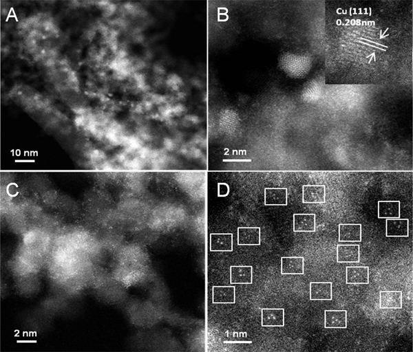 圖1. (A),(B) Cu納米粒子(Cu-NPs/ND@G) 的球差電鏡表征;(C),(D) 亞納米尺度Cu3金屬團簇(Cu3/ND@G)的球差電鏡表征。