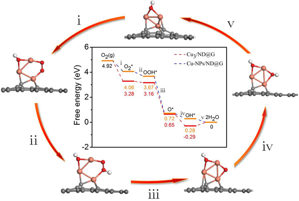 圖2. Cu3/ND@G各種中間體沿模擬氧化酶反應路徑的優化吸附構型和Cu3/ND@G、Cu-NPs/ND@G模擬氧化酶機理的自由能圖。灰色、棕色、紅色和白色的球分別代表C、Cu、O和H原子。