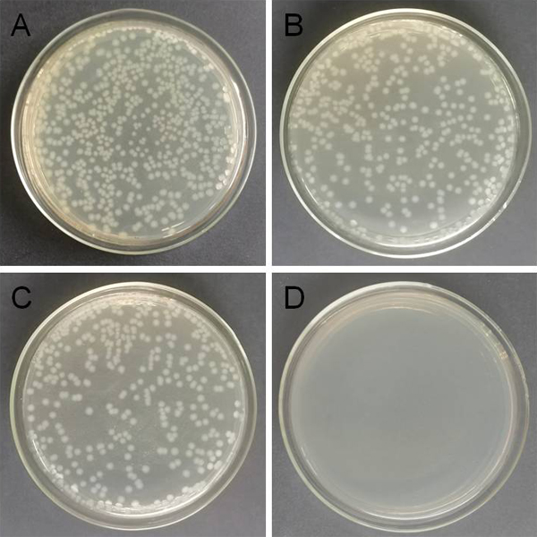 圖3. 生長抑制試驗:將不同的材料和大腸桿菌菌液孵育后涂在LB瓊脂平板上。用(A)空白、(B) ND@G、(C) Cu-NPs/ND@G和(D) Cu3/ND@G處理。培養條件:37 和24小時。