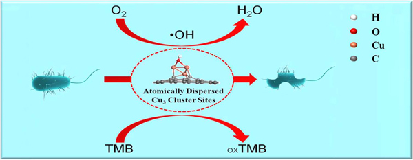隨著現代社會的不斷進步與發展,越來越多的病菌也隨之出現,并嚴重的威脅著人類的健康,尋找新型抗菌材料刻不容緩。納米酶是一類具有模擬酶催化活性的納米材料,其因強大多樣的酶催化活性而備受關注。研究發現一些納米酶具有模擬氧化酶、過氧化物酶等催化活性,其產生的活性氧物質可以有效的滅活細菌。目前,在構建具有優異模擬酶催化活性的新型納米酶方面仍然存在挑戰。與單原子催化劑相比,亞納米尺度原子級分散且完全暴露的金屬團簇催化劑不僅能提供相鄰的金屬原子作為催化位點,而且能保持充分的原子利用效率,提供了多種結構可能性和催化可行性。將這種原子級分散且完全暴露的金屬團簇催化劑應用于抗菌領域,可以有效的提升抗菌性能保護人們的健康。