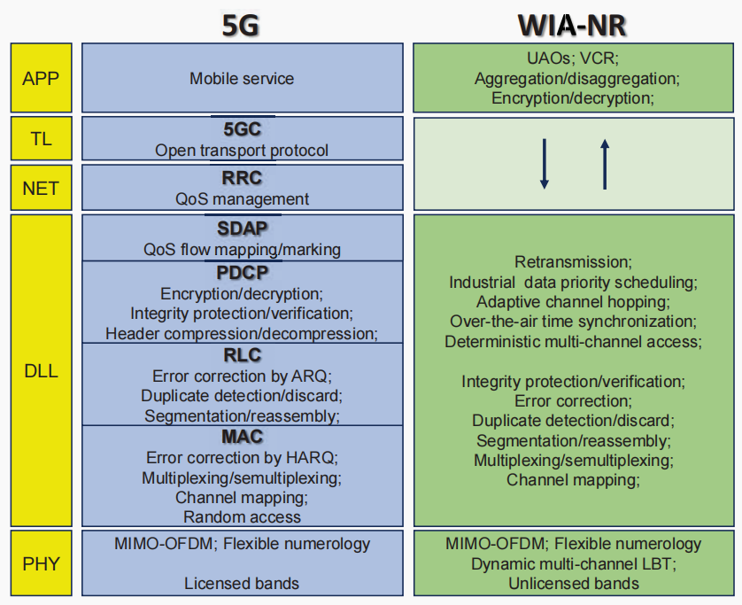 為此,沈陽自動化所科研人員基于WIA-PA和WIA-FA的原創(chuàng)技術(shù)思想,以5G底層空口技術(shù)為基礎(chǔ),融合WIA-PA和WIA-FA的自適應(yīng)跳頻、無線時間同步、工業(yè)數(shù)據(jù)優(yōu)先級調(diào)度等關(guān)鍵技術(shù),設(shè)計了全新的工業(yè)5G網(wǎng)絡(luò)架構(gòu)及協(xié)議體系WIA-NR。系統(tǒng)級仿真結(jié)果表明,在非授權(quán)頻段,WIA-NR可以在99.999%可靠性前提下實現(xiàn)1ms的空口傳輸時延,并與WiFi等非授權(quán)頻段網(wǎng)絡(luò)和諧共存。