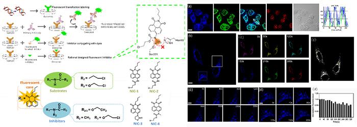 近日,中國科學院大連化學物理研究所復雜分子體系反應動力學研究組研究員韓克利團隊基于氨基甲酸酯母核的結構與功能關系,設計并發展了小分子抑制劑型熒光探針(SMI-probe),在重要的藥物代謝酶羧酸酯酶(Carboxylesterases,CEs)的實時熒光高分辨檢測中取得了良好的應用效果。由于抑制劑型探針分子NIC-4的分子結構簡單,體積小,且具有針對CEs的超分辨響應靈敏度,因此在細胞原位檢測中能夠獲得更加真實的成像效果,為亞細胞器層面的酶標記提供了新的設計思路與成功范例。