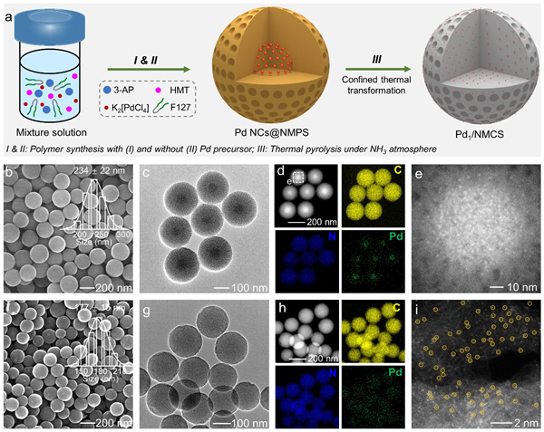 圖1. 氮摻雜介孔碳球負載Pd單原子催化劑的制備流程圖以及電鏡表征圖:(b-e) Pd-NCs@NMPS;(f-i) Pd1/NMCS