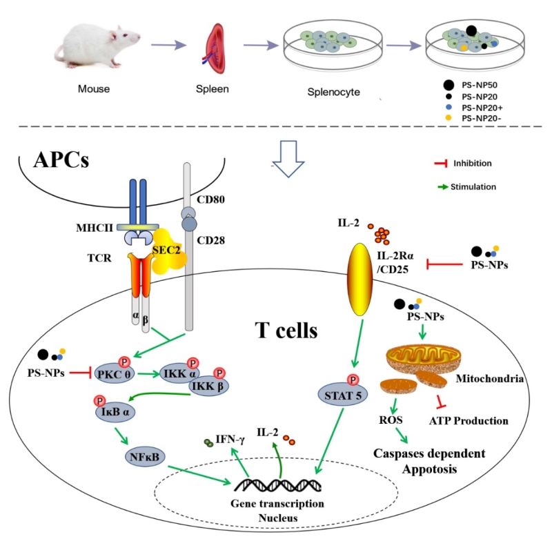 研究發(fā)現(xiàn),不同粒徑、不同電荷的聚苯乙烯納米塑料均可進入小鼠脾淋巴細胞內(nèi)部,并在高濃度下造成免疫細胞活力的顯著降低,誘導發(fā)生細胞凋亡。在免疫功能方面,納米塑料可顯著抑制T淋巴細胞的活化,下調(diào)細胞表面標志物的表達,抑制 CD8+毒性T 淋巴細胞的分化及相關細胞因子的分泌。毒理機制方面,納米塑料顯著抑制T淋巴細胞活化的關鍵信號通路PKC -NF B 和 IL-2R/STAT5,從而影響其免疫功能的發(fā)揮。研究還發(fā)現(xiàn)納米塑料的毒理效應與粒徑、表面電荷、染毒濃度和作用時間密切相關。帶負電和不帶電的納米塑料可導致胞內(nèi)活性氧自由基(ROS) 的累積從而影響線粒體功能,而帶正電的納米塑料直接導致線粒體膜電位的去極化。研究成果可為納米塑料污染的生態(tài)風險預測提供科學依據(jù)。