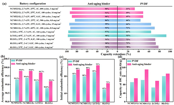 圖1 抗衰老粘結劑和傳統的PVDF粘結劑在多種層狀氧化物鋰電池中的性能對比