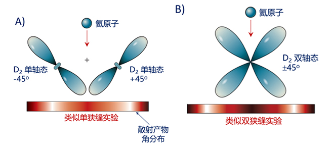 隨著激光、分子束等實驗技術的快速發(fā)展,科學家們已經(jīng)可以對碰撞分子的量子態(tài)和空間取向進行精細調(diào)控,這也使深入研究分子碰撞中的量子立體動力學成為可能。該評述文章詳細介紹了同期《科學》雜志發(fā)表的關于分子非彈性碰撞傳能過程的立體動力學及量子干涉現(xiàn)象的研究。通過利用斯塔克誘導的激光絕熱拉曼通道激發(fā)方法,美國科學家成功實現(xiàn)了對D2分子的高效振動態(tài)激發(fā),并選擇性地精準制備了兩種具有不同特性的量子態(tài):一個在空間具有確定取向的振動激發(fā)態(tài),其分子鍵軸取向和參考軸具有+45或者-45度的夾角,稱為單軸態(tài);另一個振動激發(fā)態(tài)來自兩個單軸態(tài)的相干疊加,即其分子鍵軸取向和參考軸同時具有+45及-45度的夾角的可能性,稱為雙軸態(tài)。通過對兩種不同量子態(tài)的D2分子與He原子非彈性散射產(chǎn)物角分布的測量,研究人員發(fā)現(xiàn)處于雙軸態(tài)的分子在散射中會表現(xiàn)出與單軸態(tài)明顯不同的實驗結(jié)果,這一差異來源于雙軸態(tài)中不同鍵軸取向之間的量子干涉。這是在分子碰撞體系中首次通過激光制備出類似于楊氏實驗的“雙狹縫”(double-slit),進而影響雙分子碰撞的微觀動力學過程。同時也為挑戰(zhàn)在化學反應碰撞中開展可控的量子干涉實驗研究提供了重要參考。