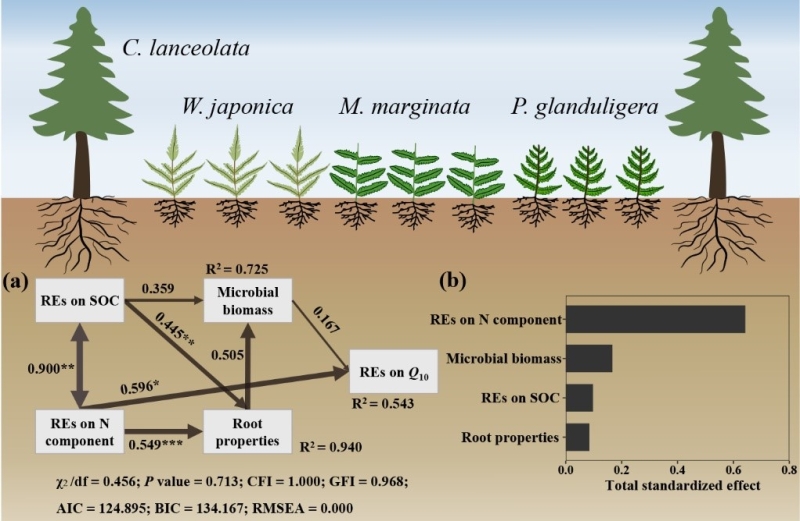 沈陽生態(tài)所人工林生態(tài)組研究團隊以中國科學院會同森林生態(tài)實驗站的杉木人工林為研究對象,采集杉木及其主要林下植被(金星蕨、狗脊和邊緣鱗蓋蕨)的根際土與非根際土,進行室內培養(yǎng)實驗,測定土壤有機碳分解的Q10,以及土壤理化性質和生物學性質。研究發(fā)現,杉木及其林下蕨類土壤有機碳分解的Q10均表現為正根際效應,范圍為33%-88%,并且金星蕨土壤有機碳分解Q10的根際效應顯著高于杉木。隨機森林模型和結構方程模型的分析結果表明,氮組分的根際效應和根際土壤微生物量是土壤有機碳分解Q10根際效應的主要驅動因子。其中,氮組分的根際效應是最重要的影響因素,對土壤有機碳分解Q10的根際效應產生正的直接作用。根際土壤微生物生物量和微生物殘體的根際效應與土壤有機碳分解Q10的根際效應均呈正相關關系。本研究表明根際土壤有機碳分解對氣候變暖更敏感,在后續(xù)利用模型預測土壤有機碳循環(huán)對氣候反饋的研究中應考慮根際土壤與非根際土壤之間的差別。