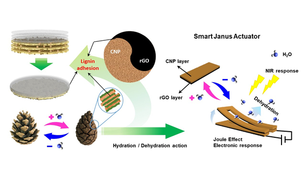 具有環境刺激響應性的柔性智能驅動器在機械、生物醫藥、傳感器、人工肌肉和機器人等領域具有巨大的應用潛力。青島能源所代謝物組學研究組的研究人員,受松果球鱗片濕度響應性形變現象的啟發,利用木質素粘合策略構建了一種新型的納米纖維素基柔性智能驅動器。