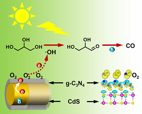 本工作中,合作團隊發展了一種光催化生物質氧化重整直接制備一氧化碳的新方法。團隊制備了一種CdS@g-C3N4核殼型催化劑,促進氧氣的吸附活化,產生羥基自由基活性氧物種;通過控制氧氣與底物的比例,既能加速反應進行,同時避免底物過度氧化至二氧化碳,成功實現了溫和條件下生物質高效的轉化為一氧化碳。在自然太陽光照條件下,該催化體系依然可以穩定催化甘油產生一氧化碳。該工作為生物質資源的有效利用提供了新的思路。