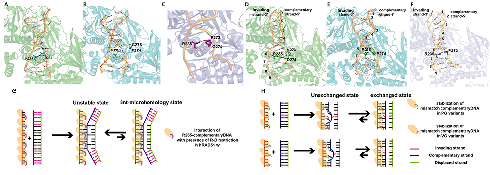為了闡明上述錯(cuò)配容忍度差異的分子機(jī)理,王宏偉團(tuán)隊(duì)通過(guò)冷凍電鏡技術(shù),解析了處于不同狀態(tài)下人源Rad51和酵母Dmc1與DNA的復(fù)合體結(jié)構(gòu)。基于上述結(jié)構(gòu)信息,李國(guó)輝團(tuán)隊(duì)進(jìn)行了系統(tǒng)的分子動(dòng)力學(xué)模擬,發(fā)現(xiàn)RAD51的Loop2區(qū)域中Val273和Asp274對(duì)應(yīng)于DMC1的Pro274和Gly275在同源重組過(guò)程中具有關(guān)鍵作用;RAD51的Loop2上Asp274與Arg235有穩(wěn)定的相互作用,并且當(dāng)Asp274突變?yōu)镈mc1中對(duì)應(yīng)的Gly后,Arg235的構(gòu)象發(fā)現(xiàn)變化,降低了互補(bǔ)鏈DNA結(jié)合自由能,提高錯(cuò)配容忍度,這也就表明同源重組過(guò)程中RAD51的Loop2上的關(guān)鍵殘基通過(guò)與Loop1上殘基的相互作用,在鏈交換過(guò)程中行使錯(cuò)配的校對(duì)功能。后續(xù)單分子熒光共振能量轉(zhuǎn)移等實(shí)驗(yàn)也證實(shí),Val273和Asp274對(duì)鏈交換效率和錯(cuò)配容忍度有一定影響。該工作揭示了基因重組過(guò)程中關(guān)鍵酶錯(cuò)配容忍度差異機(jī)制。