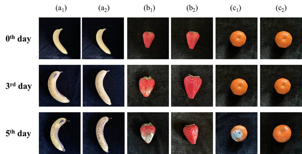 圖1 隨著時(shí)間延長(zhǎng),放置在304不銹鋼和304-Cu不銹鋼餐盤中的新鮮水果的外觀變化,(a)香蕉;(b)草莓;(c)沙糖桔。下角標(biāo):1=304不銹鋼;2=304-Cu不銹鋼。