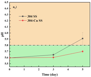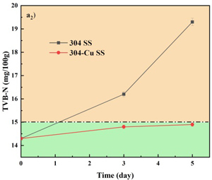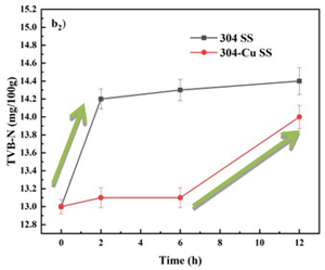 圖2 在不同放置溫度下,在304不銹鋼和304-Cu不銹鋼餐盤中的冷鮮肉的pH值和鹽基氮(TVB-N)值變化情況,(a)4 1 ;(b)23 2 。下角標(biāo):1=pH;2=TVB-N