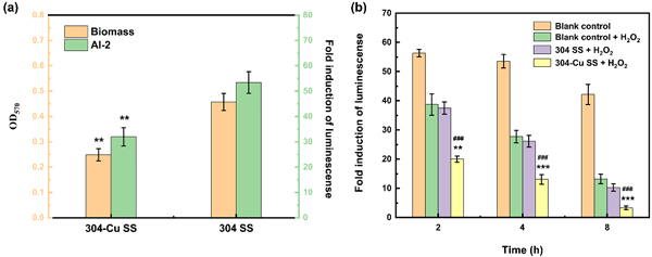 圖4 (a)304不銹鋼和304-Cu不銹鋼與E.coli共培養(yǎng)10小時(shí)后,其表面生物膜形成量及對(duì)應(yīng)的AI-2信號(hào)表達(dá)水平;(b)不同處理組對(duì)AI-2信號(hào)活性的影響。