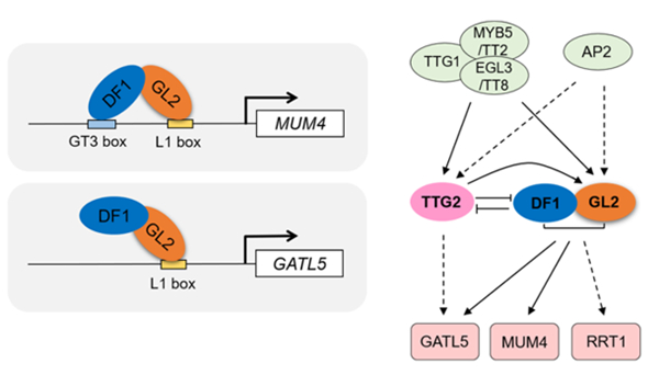 此外,該研究還發現DF1與GL2的表達均受到TTG2的直接調控,TTG2通過結合DF1與GL2啟動子中的W box元件從而抑制DF1的表達,激活GL2的表達。有趣的是,DF1亦能直接抑制TTG2的表達。因此,在轉錄水平上DF1與TTG2之間存在一個負反饋環。