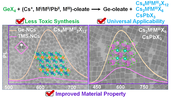 相關研究成果以“Germanium Halides Serving as Ideal Precursors: Designing A More Effective and Less Toxic Route to High Optoelectronic Quality Metal Halide Perovskite Nanocrystals”為題,于近日發表在《納米快報》(Nano Letters)上。上述工作得到了國家自然科學基金等項目的資助。