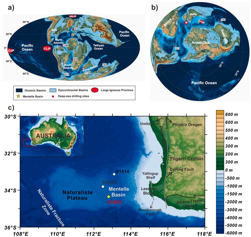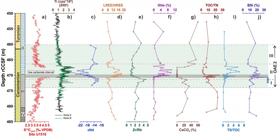 研究人員利用該航次在曼達岬海盆鉆取的U1516站位巖芯沉積物,基于極好的鈣質生物化石碳同位素和古生物地層年代約束,通過沉積學、粘土礦物學以及地球化學方法,詳細揭示了晚白堊紀階段研究區沉積物來源、陸源區氣候條件、海表生物生產力和海底氧化-還原環境的演化歷史及其對OAE 2的響應。物源分析結果表明,所研究碎屑沉積物主要來自于澳大利亞西南部大陸,而海底火山成因物質的貢獻較小(圖2)。其中,在OAE 2碳同位素發生顯著性正向偏移的階段(圖3),U1516站位的陸源河流物質輸入量顯著增加,并伴隨著物源區的明顯變化——由澳大利亞西南部近源地塊(如珀斯盆地和魯紋地塊)轉變為遠源地塊(如依爾崗克拉通和奧爾巴尼-弗雷澤造山帶,圖2)。