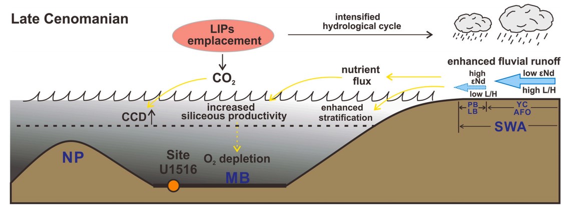 研究人員認為上述物源變化反映了OAE 2期間溫室氣候條件下南半球高緯度地區水循環的加劇,由此引起了澳大利亞西南部大陸河流系統的重組,且河流入海物質(碎屑、營養和有機質及淡水)通量的增加還促進了附近海域海表生物生產力的勃發及海底缺氧性沉積環境的發育(圖3)。此時周邊大火成巖省的強烈火山活動雖然對研究區沒有直接的物質輸入貢獻,但由其排放的大量溫室氣體二氧化碳卻有利于上述氣候環境的形成與保持。在此基礎上,陸源有機質和海表生物生產力來源有機質在缺氧性的底層水環境中得以大量地保存下來,從而形成了黑色頁巖這種OAE 2階段最典型的海洋沉積物,這進一步證實了當時南半球高緯度地區的暖濕氣候條件以及大氣圈、水圈、巖石圈和生物圈之間的緊密聯系(圖4)。