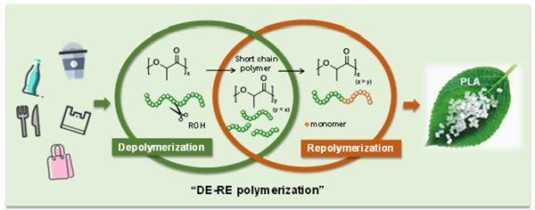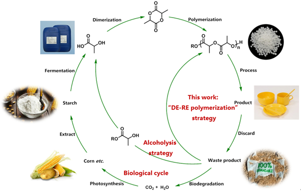 近日,青島能源所王慶剛研究員帶領(lǐng)的催化聚合與工程研究組發(fā)展了一種聚合物降解再聚合的升級(jí)化學(xué)循環(huán)新策略(“DE-RE polymerization” strategy),以“聚合物到聚合物”的方式成功實(shí)現(xiàn)了聚乳酸廢棄物到新聚乳酸材料的循環(huán)再利用過程(如圖2所示)。該策略的反應(yīng)條件溫和,副反應(yīng)少,減少了完全重新生產(chǎn)聚乳酸的原料消耗,最大程度的提高了聚乳酸的回收再利用效率。在再聚合過程中,通過加入不同類型單體可以獲得性質(zhì)各異的最終材料。該成果為聚乳酸的循環(huán)提供了一種新的解決思路,促進(jìn)了可持續(xù)社會(huì)的發(fā)展。此外,該策略不僅在化學(xué)回收方面有效,在聚合物的改性和合成方面都具有廣闊的發(fā)展前景。
