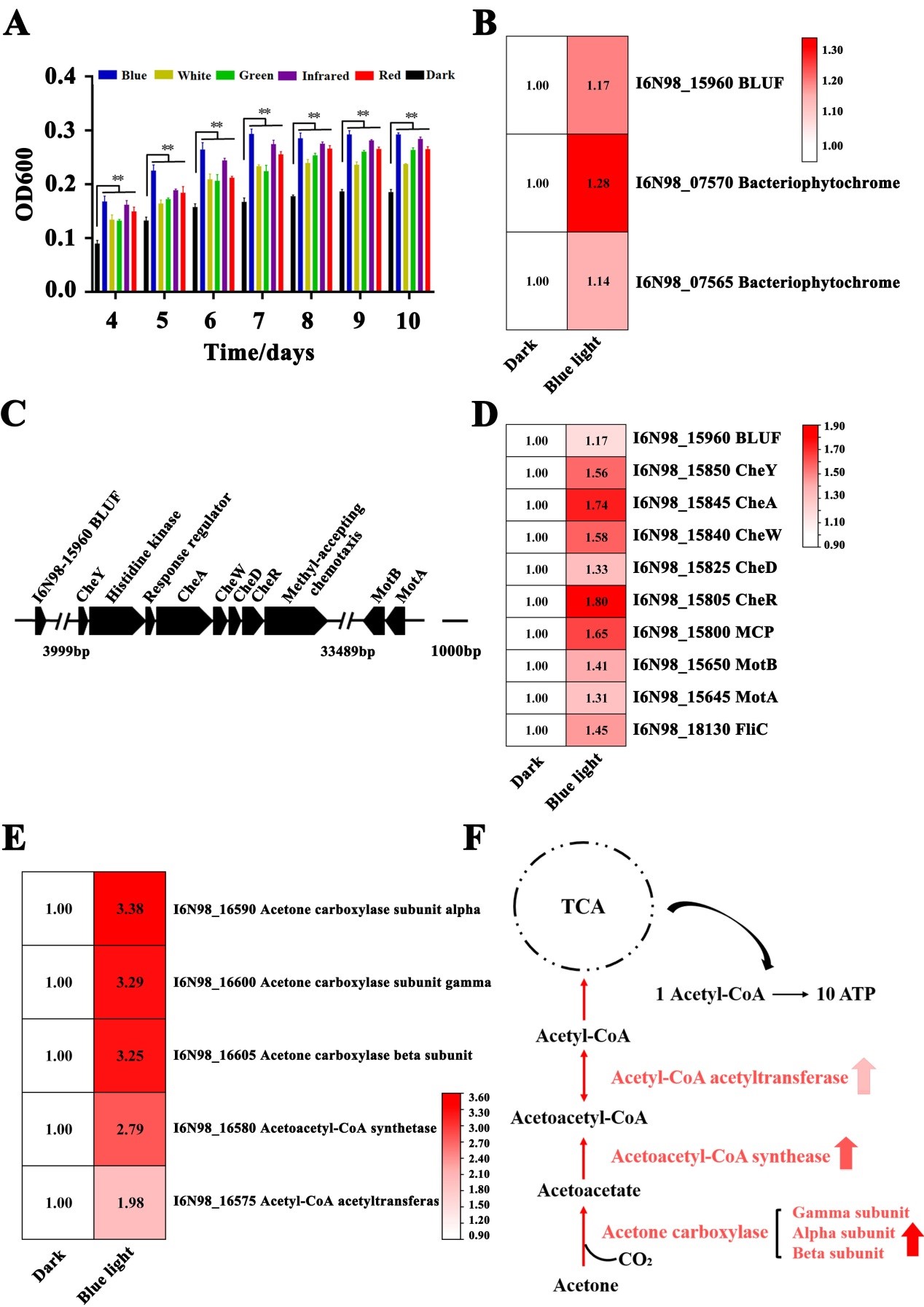 圍繞如上科學(xué)問題,孫超岷研究團隊基于“科學(xué)”號2017年從我國南海深海海域一處冷泉噴口附近采集的沉積物,采用藍光富集培養(yǎng)技術(shù)從沉積物樣品中獲得了一株海綿桿菌。研究發(fā)現(xiàn),相比于其它類型的光,該菌株在藍光(470 nm)照射下可獲得最快生長速度。但基因組測序表明,該菌株不包含葉綠素合成通路及視紫紅質(zhì)編碼基因,不屬于常見的光能利用類型。蛋白質(zhì)組結(jié)果表明,該細菌藍光感受蛋白BLUF在感受藍光過程中發(fā)揮著重要作用,研究人員通過分子遺傳學(xué)手段把編碼BLUF的基因敲除掉,發(fā)現(xiàn)該細菌感知藍光的能力明顯減弱,進一步驗證了蛋白組的結(jié)果;與體內(nèi)實驗的結(jié)果一致,體外表達的藍光蛋白也顯示了明顯的藍光感受活性。以上蛋白組學(xué)、遺傳學(xué)及生物化學(xué)實驗結(jié)果綜合證實了藍光感受蛋白BLUF介導(dǎo)了深海細菌對藍光的感知,并進一步激活了乙酰輔酶A的合成通路,進而顯著增強了三羧酸循環(huán)通路及能量產(chǎn)生,最終促進了菌株的快速生長。值得注意的是,藍光感受器BLUF的同源蛋白廣泛分布于深海微生物中,表明了很多深海來源的微生物也能通過類似的途徑感受并利用藍光,也提示微生物學(xué)家在今后的研究中需要考慮微生物介導(dǎo)的光能代謝對深海生態(tài)系統(tǒng)能量循環(huán)的貢獻。