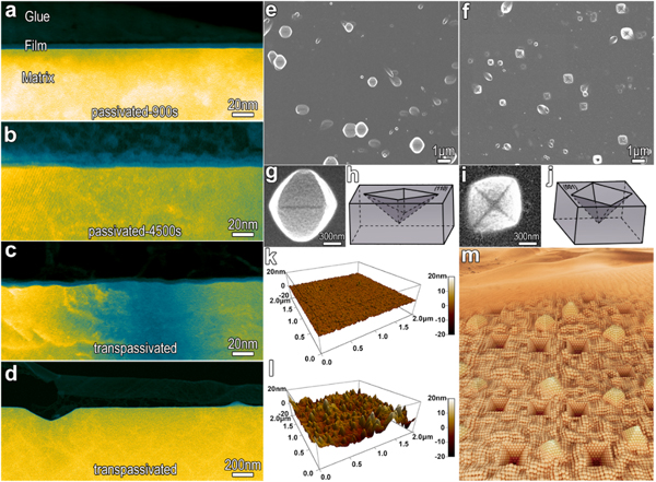 圖1:金屬/鈍化膜界面的晶面重構。(a-b)單晶合金在0.5 mol L-1 H2SO4溶液中0.4V/SCE鈍化900s和4500s的HAADF-STEM像;(c-d)單晶合金在0.5 mol L-1H2SO4 溶液中先在0.4V/SCE下鈍化900s,而后在1.1V/SCE過鈍化3600s的HAADF-STEM像; (e-f)SEM圖像表明過鈍化處理在(110)表面及(001)表面上形成不同外形的凹坑;(g-j)不同表面上凹坑的局部放大圖及示意圖; (k-l)鈍化和過鈍化表面的AFM圖像; (m)過鈍化后的形貌示意圖,表面的起伏由密排的{111}晶體學面構成。
