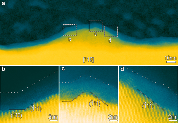 圖2:過鈍化處理將界面修飾成由密排{111}晶體學面構成的低能界面。(a)起伏界面的HAADF-STEM像;(b-d)圖a中標示位置的局部放大圖。