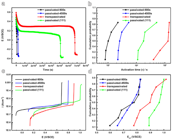 圖3:低能密排界面提高材料的耐還原溶解及抗點蝕能力。(a)室溫下FeCr15Ni15單晶合金在5.6 mol L-1H2SO4 溶液中的開路電位衰減曲線,密排{111}界面的形成顯著延長了活化時間;(b)活化時間的累計概率分析;(c)不同條件處理的FeCr15Ni15單晶合金在3.5%NaCl溶液中(50 )的動電位極化曲線;(d)點蝕電位的累計概率分析。