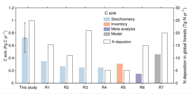 針對這一問題,中國科學院沈陽應用生態(tài)研究所方運霆研究員團隊建立了中國森林生態(tài)系統(tǒng)15N示蹤網(wǎng)絡,由15個站點20個森林組成。基于該網(wǎng)絡中9個15N成對標記站點和歐美4個成對15N示蹤實驗結果,該團隊聯(lián)合中國北京大學、清華大學、東北師范大學、北京師范大學、南京信息工程大學、河南大學、中國科學院亞熱帶農業(yè)生態(tài)研究所、西雙版納熱帶植物園、植物研究所、中國林科院熱帶林業(yè)研究所、法國氣候與環(huán)境科學實驗室、英國利茲大學、丹麥哥本哈根大學、荷蘭瓦戈寧根大學、美國密歇根大學、新罕布什爾大學、紐約州立大學賓漢姆頓分校、日本京都大學等多家單位,首次量化了不同形態(tài)沉降氮在不同類型森林生態(tài)系統(tǒng)中的去向及其對全球森林碳匯的貢獻。研究發(fā)現(xiàn)70%左右的氮沉降被森林生態(tài)系統(tǒng)截留,而且森林生態(tài)系統(tǒng)(植物+土壤)對銨態(tài)氮和硝態(tài)氮的總截留效率相近。但植物吸收更多硝態(tài)氮,表明森林植物可能偏好利用硝態(tài)氮(圖1)。該研究利用沉降氮去向和分配的研究結果進一步評估了全球氮沉降在全球森林的分配及其對森林碳匯功能的貢獻與空間格局,發(fā)現(xiàn)全球每年的氮沉降能增加森林碳匯0.72 Pg C yr-1,占全球陸地生態(tài)系統(tǒng)碳匯的20%左右,高于以往的研究結果(圖2),說明過去的研究很可能低估了氮沉降對陸地生態(tài)系統(tǒng)碳匯的貢獻。