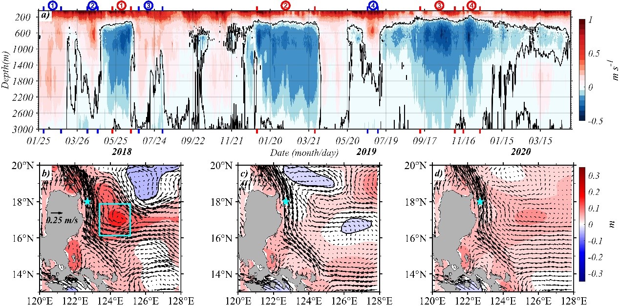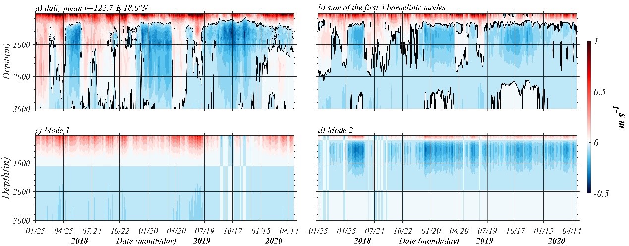 分析發現,上層海洋的中尺度渦旋運動是引發源地黑潮和呂宋潛流變化的關鍵因素,強勁的海洋上層反氣旋渦旋會導致呂宋潛流出現暫時性的減弱乃至反向。研究團隊利用垂直模態分解方法研究了不同模態在源地黑潮和呂宋潛流變化中的作用,結果顯示第一和第二斜壓模解釋了黑潮和呂宋潛流的主要垂直結構特征,其中,呂宋潛流發生反向主要是由第一斜壓模導致的,但呂宋潛流的季節內變化主要是由第二斜壓模導致的。該項研究為認識熱帶太平洋西邊界流系統提供了關鍵的直接觀測證據。