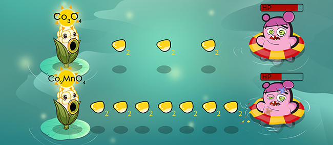 上方豌豆射手添加Co3O4,發射少量豌豆(代表氧氣);下方豌豆射手添加Co2MnO4,可長時間、穩定、快速地發射豌豆,代表高效穩定地催化電解水反應