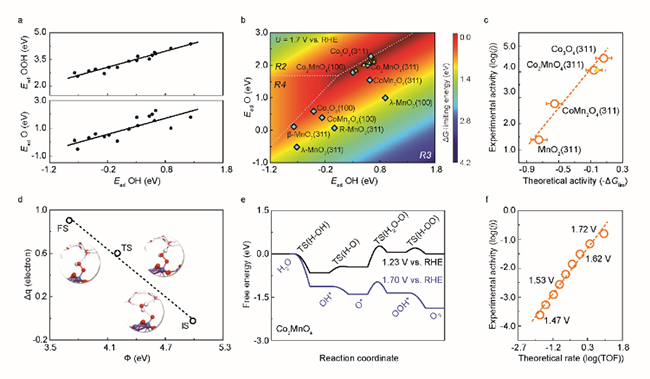(a)中間物種吸附能的scaling關系;(b)OER活性截頂火山型曲線;(c)理論活性與實驗的對比;(d)電荷外插值法計算電化學過程能壘;(e)不同電壓下的反應能線圖;(f)微觀動力學模擬驗證不同電壓下理論活性的準確性。