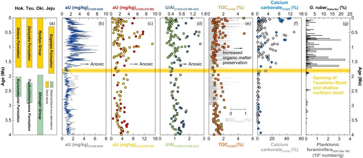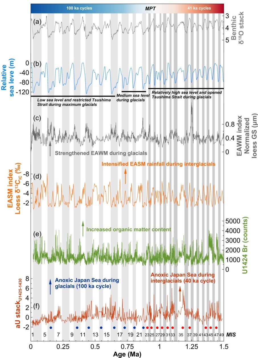 針對以上問題,研究人員基于日本海綜合大洋鉆探計劃(IODP)U1425和U1430站位樣品,利用高分辨率氧化還原敏感元素指標重建了上新世以來日本海氧化還原環境演化歷史,發現日本海水體在170萬年前由相對氧化的環境變為氧化-缺氧高頻轉變的環境。研究認為這種轉變主要是由于日本海東北部抬升,海峽變淺,從而阻礙了富氧的北太平洋中層水的進入;同時西南部的對馬海峽打開,但受控于更新世冰期-間冰期海平面的頻繁波動,日本海只能階段式與東海相連通,因此出現氧化-缺氧高頻轉變的現象。在軌道尺度上,發現中更新世轉型之前日本海在冰期為氧化環境,但轉型之后則變為冰期為缺氧環境。研究認為轉型之前冰期海平面最大下降僅約90米,對馬暖流仍可通過對馬海峽流入日本海,結合減弱的夏季風降水,使得日本海表層水體鹽度升高,從而促進水體的下沉。同時,強盛的冬季風更加有利于水體的混合,因此日本海在冰期時較為氧化。但轉型后冰期海平面下降達120米,對馬海峽幾乎完全關閉,此時日本海也幾乎為封閉停滯的狀態,因此相比于轉型前要更加缺氧。