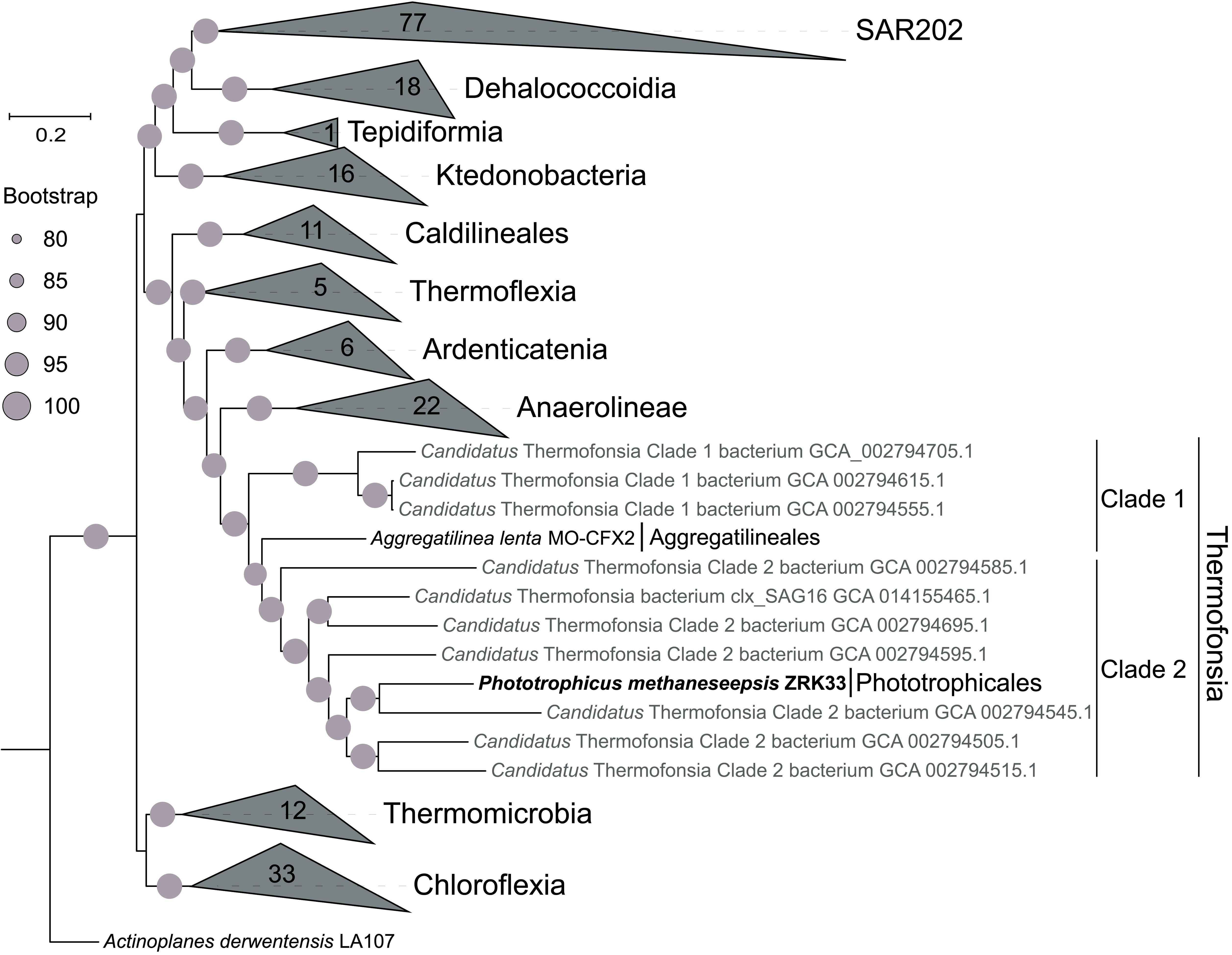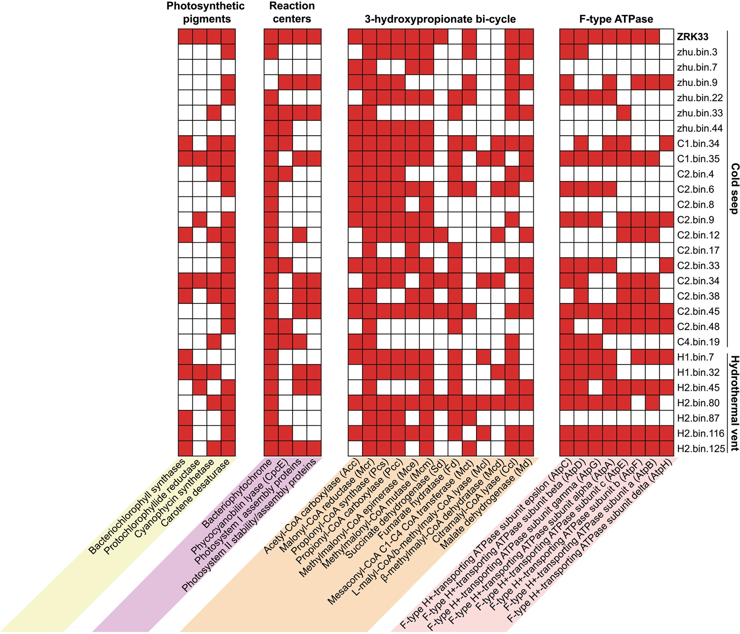 孫超岷研究團(tuán)隊(duì)通過在基礎(chǔ)培養(yǎng)基中添加利福平的方法富集培養(yǎng)了一批綠彎菌,通過不斷傳代培養(yǎng),最終獲得了3株綠彎菌純培養(yǎng)。其中,有一株綠彎菌(命名為Phototrophicus methaneseepsis ZRK33)屬于暫定綱 Thermofonsia分支2,該類群被推測可能是一類新型的光合細(xì)菌,但因?yàn)槿狈兣囵B(yǎng)菌株一直未被證實(shí)。獲得純培養(yǎng)菌株后,研究人員通過16S rRNA基因和基因組進(jìn)化分析等手段證實(shí)該菌株是一個新目分類階元的代表菌株。基因組測序發(fā)現(xiàn),該深海綠彎菌菌株有完整的光合作用通路,提示其可能有利用光能的潛力。進(jìn)一步的實(shí)驗(yàn)表明不同光照尤其是紅光能夠促進(jìn)該菌株的生長,證實(shí)了其利用光能的特性。利用轉(zhuǎn)錄組學(xué)手段揭示了在紅光照射條件下,該菌株基因組中與光合作用相關(guān)的一系列關(guān)鍵因子的表達(dá)均得到了顯著提升,證實(shí)了其通過光合作用方式利用光能。